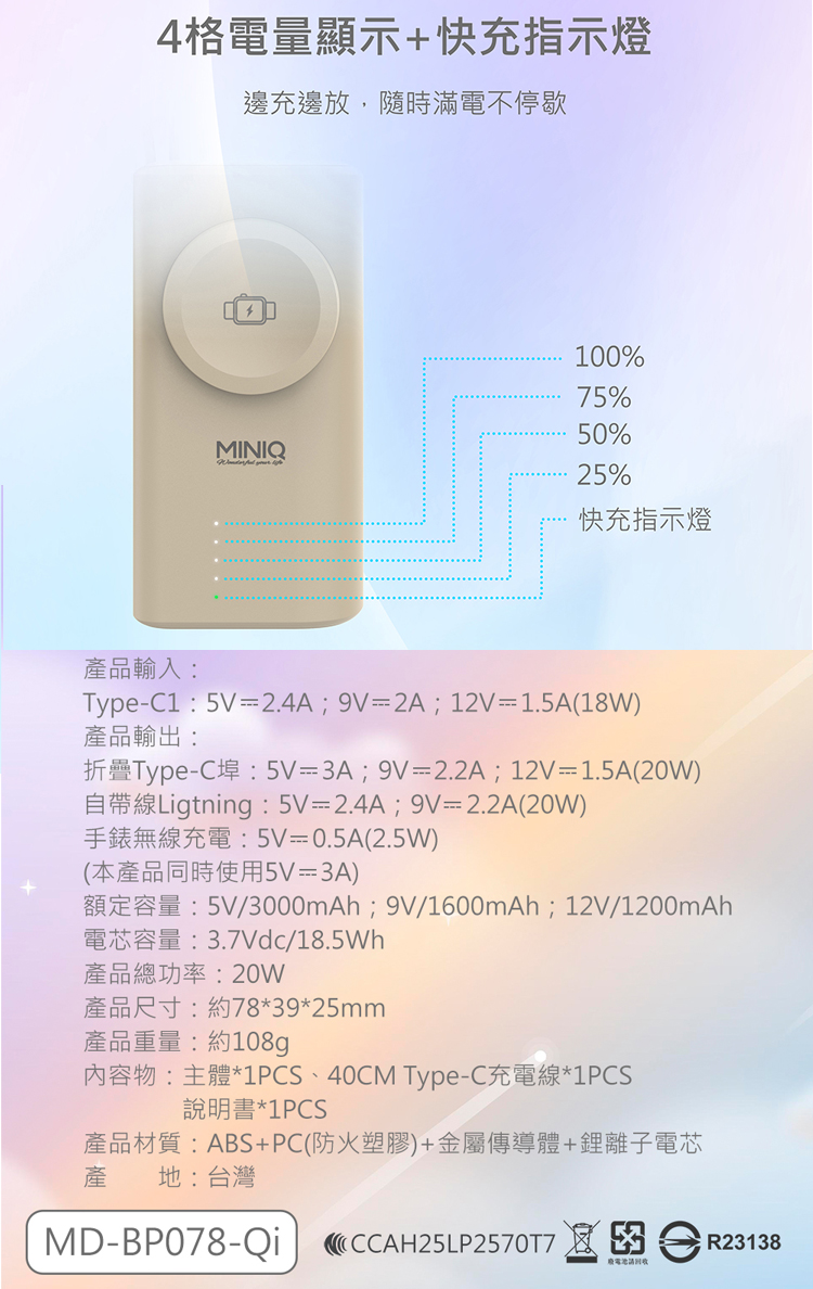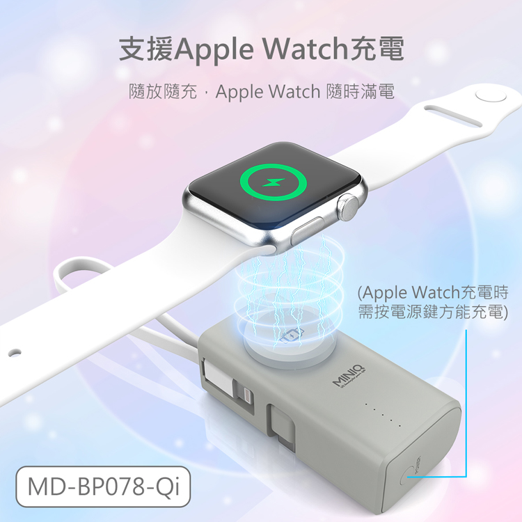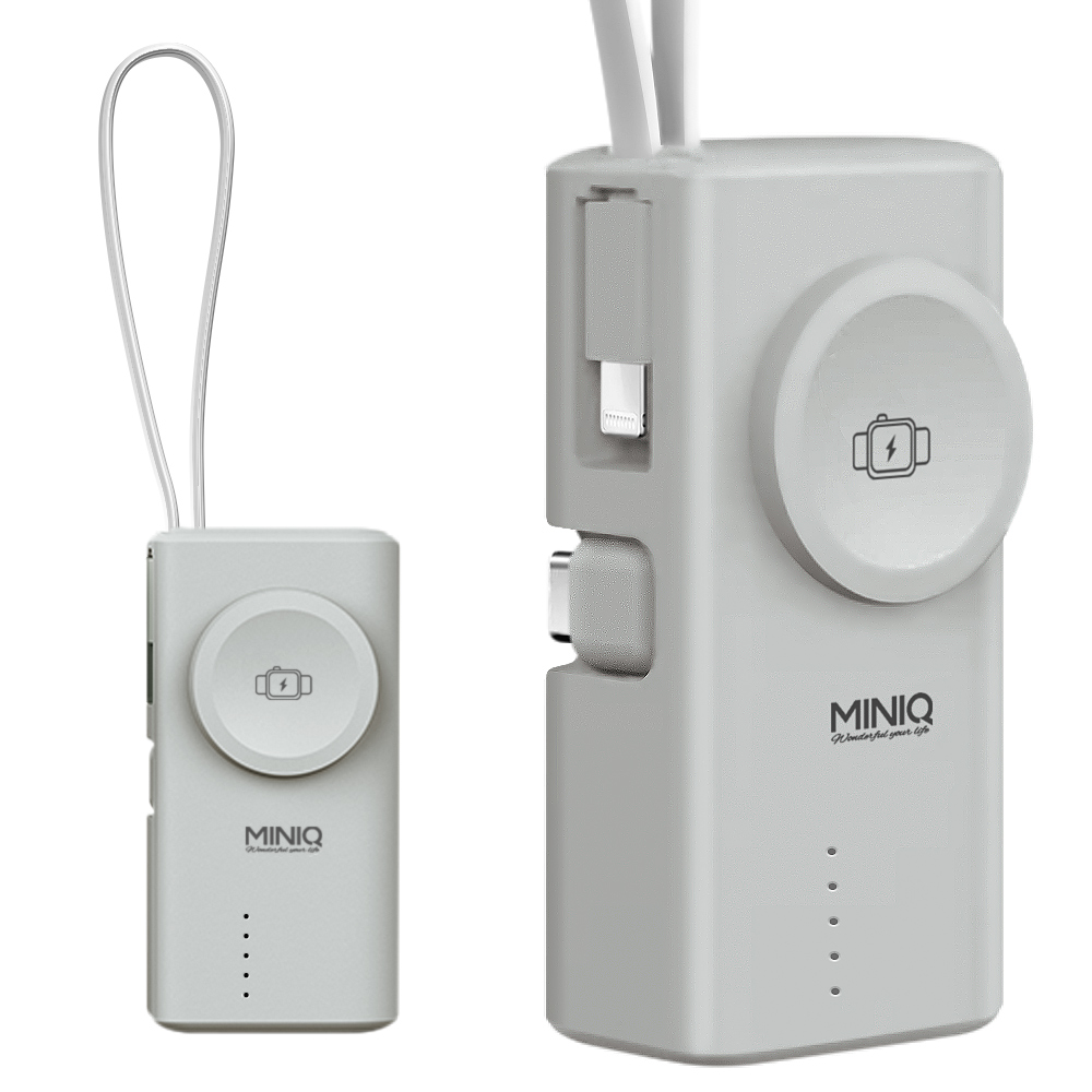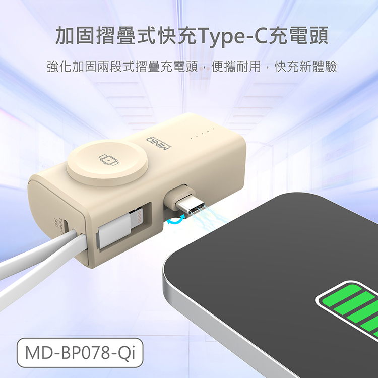 MiniQ MD-BP078-Qi 4合1迷你行動電源 自帶Lightning充電線+摺疊Type-C插頭(台灣製)-神秘灰