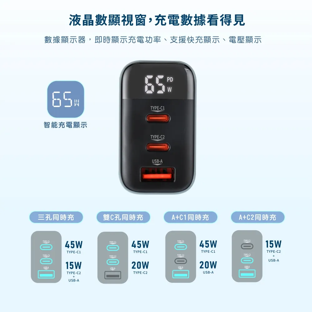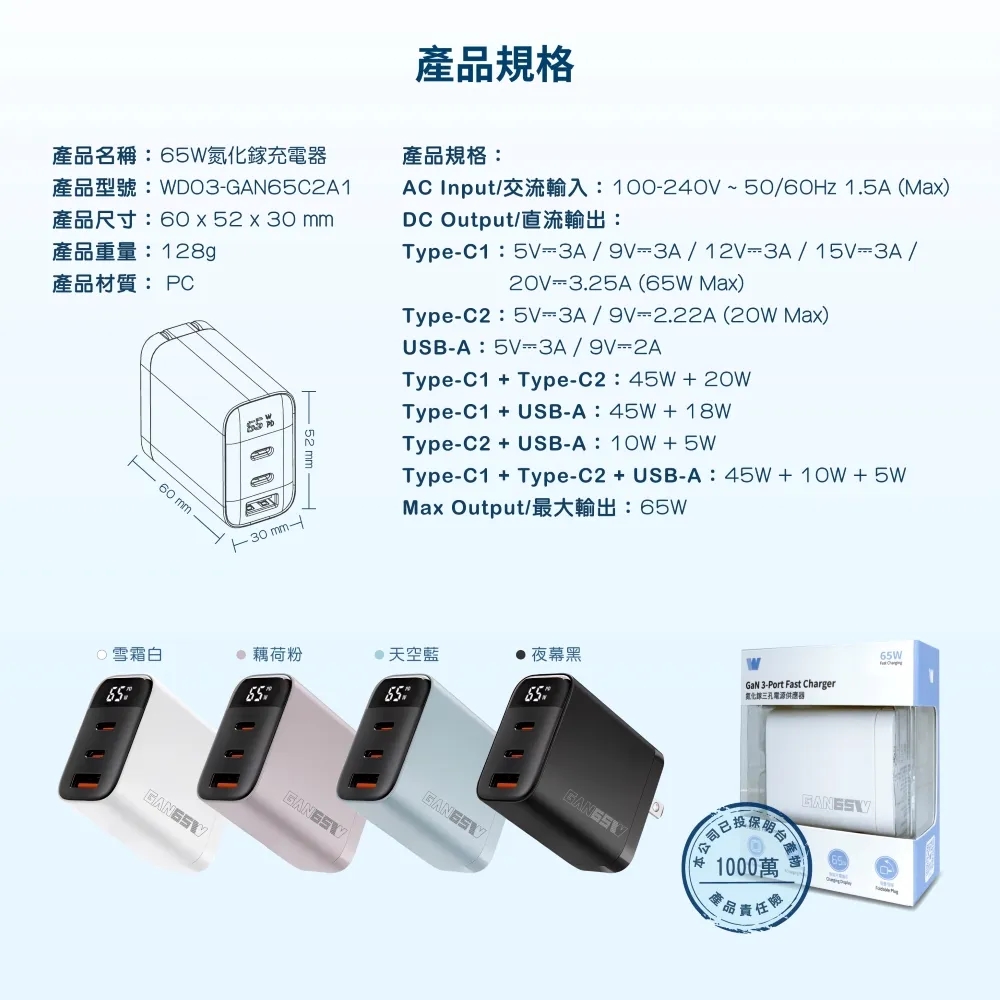 Wephone 65W氮化鎵三孔快速充電器-夜幕黑