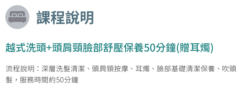 越式洗頭+頭肩頸臉部舒壓保養50分鐘(贈耳燭)(25M0)