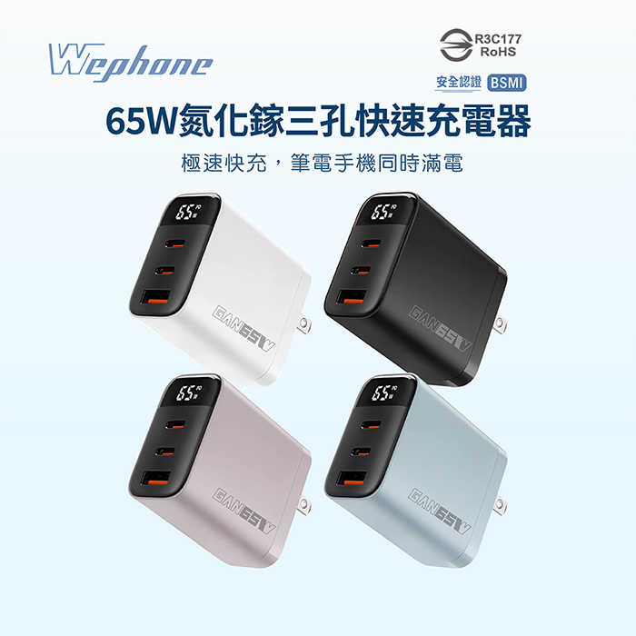 【Wephone】GaN氮化鎵65W 數字顯示三孔快速充電器(2C1A)