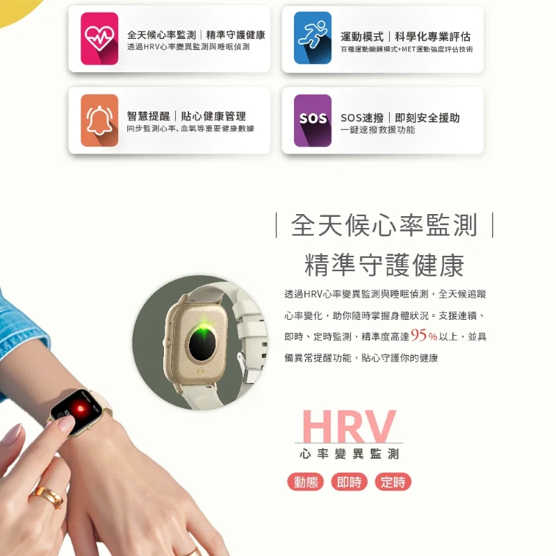 全天候心率監測|精準守護健康:透過HRV心率變異監測與睡眠偵測,全天候追蹤心率變化