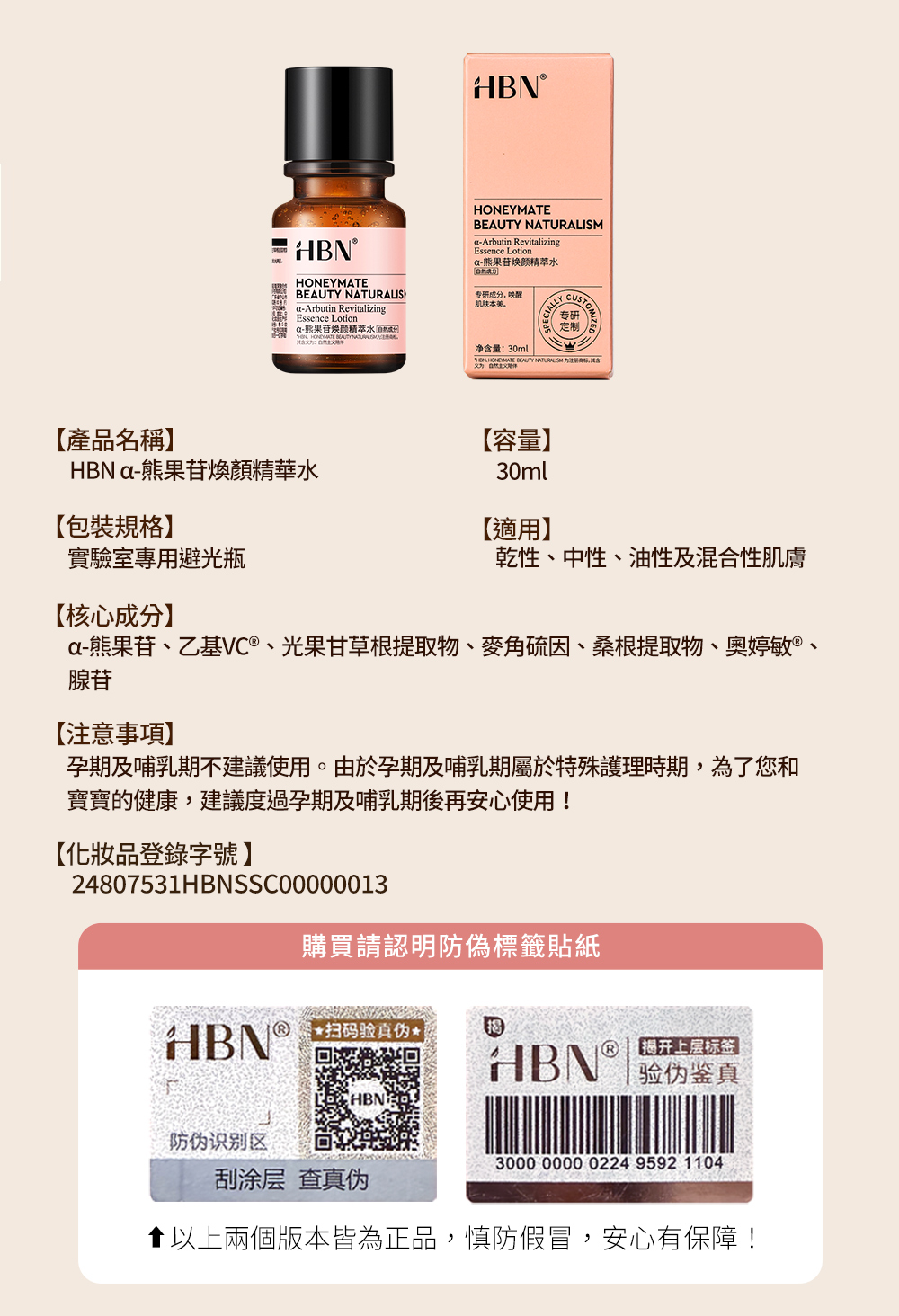 品名:【HBN官方】α-熊果苷煥顏精萃水 30ml (普通版發光水2.0)