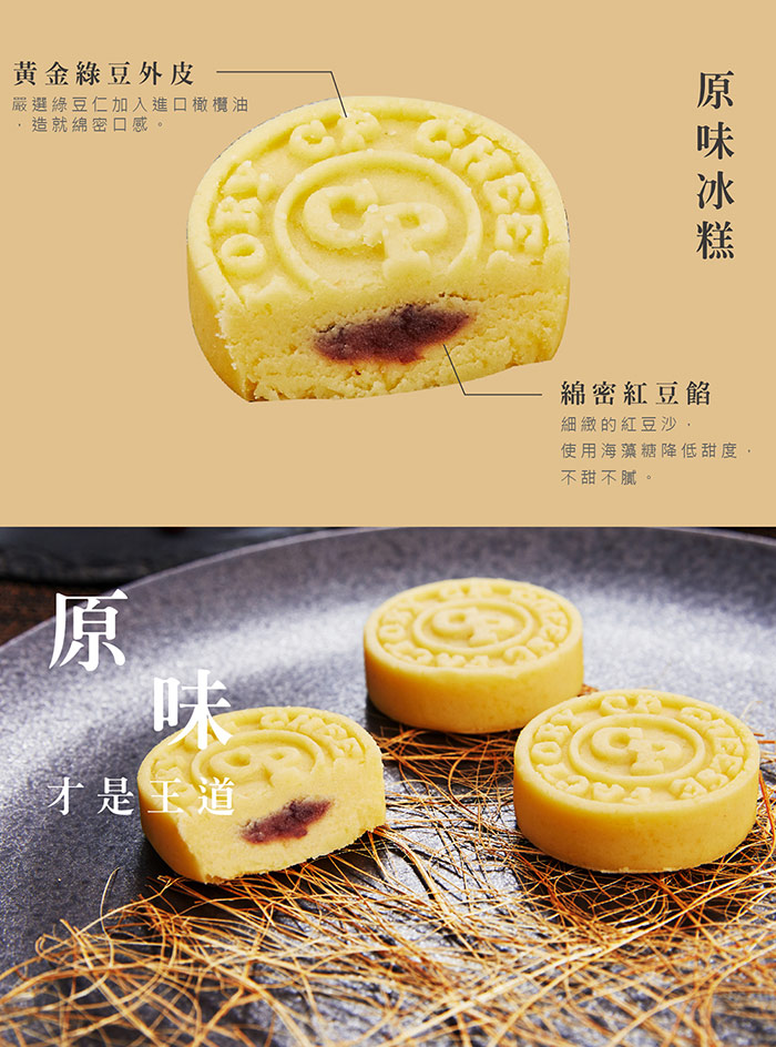 黃金綠豆外皮嚴選綠豆仁加入進口橄欖油,造就綿密口感,內餡是細緻的紅豆沙,使用海藻糖降低甜度,不填不膩。