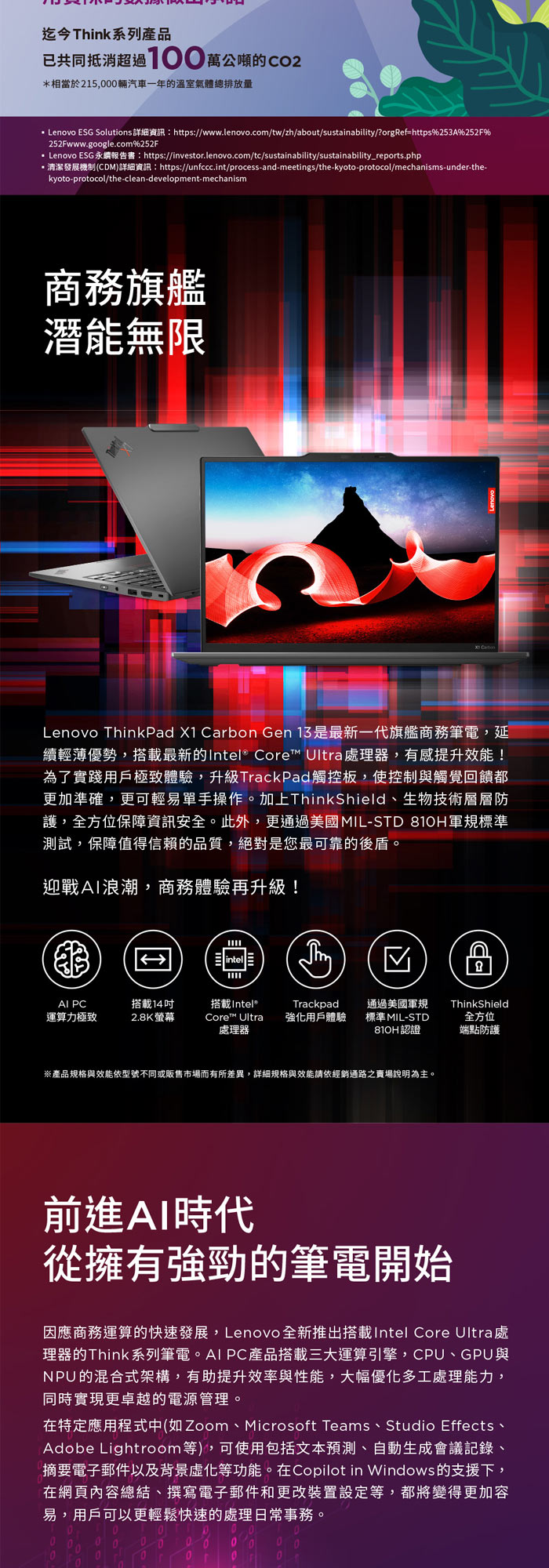 《Lenovo 聯想》ThinkPad X1 Carbon Gen 13(14吋WUXGA/Ultra 7 255H/32G/1TB SSD/Win11Pro)