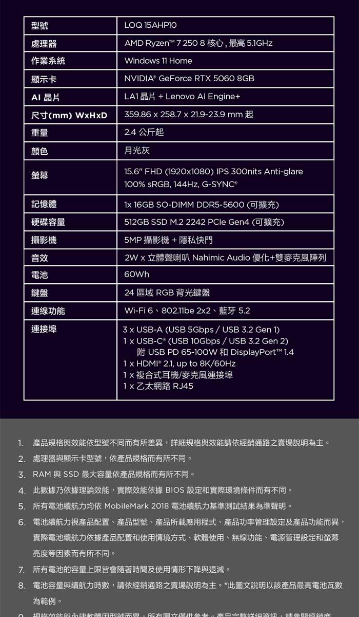 《Lenovo 聯想》LOQ 15AHP10 83JG004STW(15.6吋FHD/R7 250/16G+32G/512G+512G/RTX5060/特仕版)