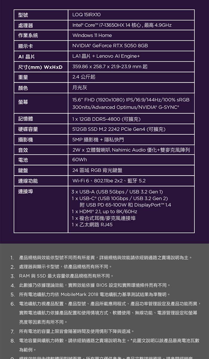 《Lenovo 聯想》LOQ 83JE00G8TW(15.6吋FHD/i7-13650HX/12G+16G/512G SSD/RTX5050/特仕版)