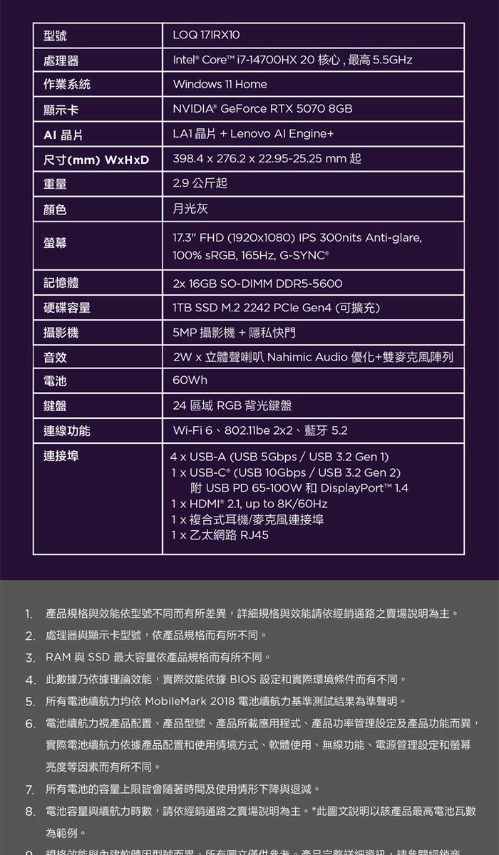 《Lenovo 聯想》LOQ 17IRX10 83JH001WTW(17.3吋FHD/i7-14700HX/32G/1TB SSD/RTX5070/Win11)