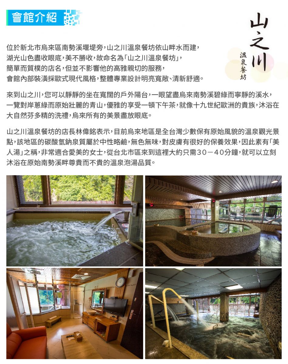 烏來【山之川溫泉會館】單人大眾裸湯+單人套餐 (MO)