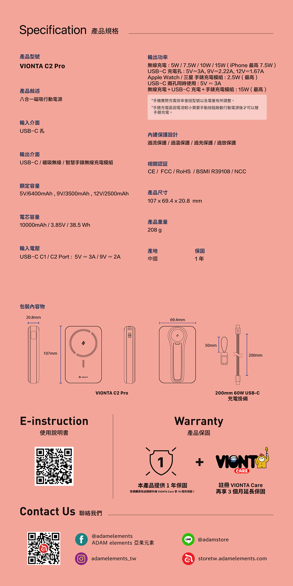 【亞果元素】VIONTA C2 Pro 八合一磁吸行動電源10000mAh(有標示Wh)-粉色