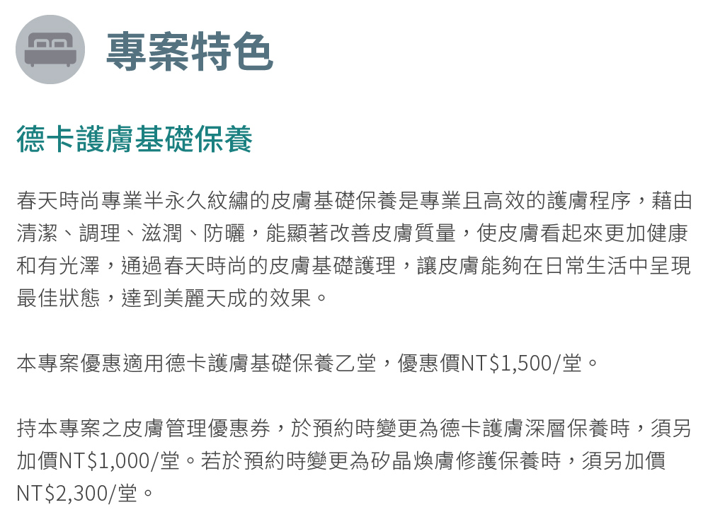 台北大安區【春天時尚】德卡護膚基礎保養NT$1,500乙堂優惠券 (MO)