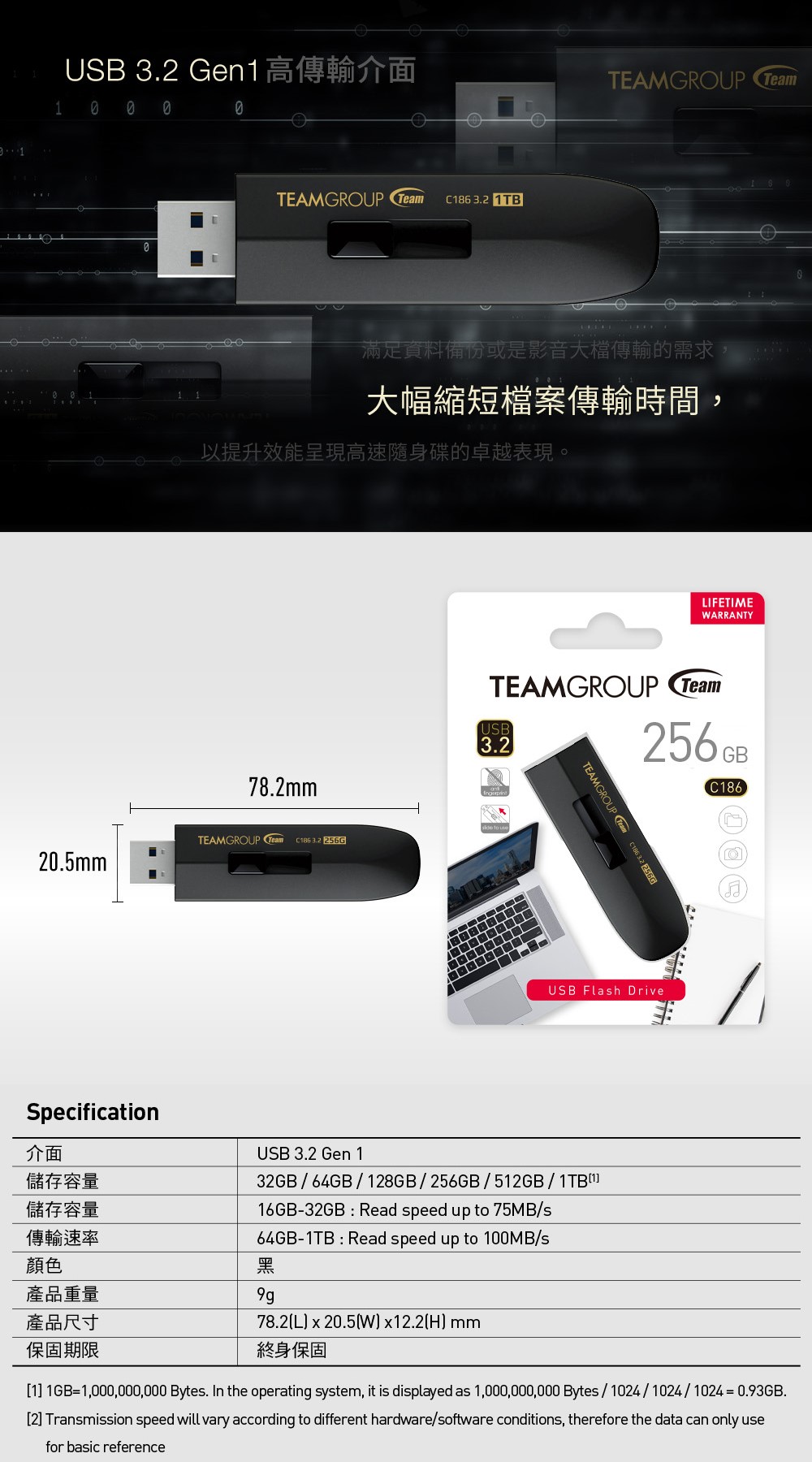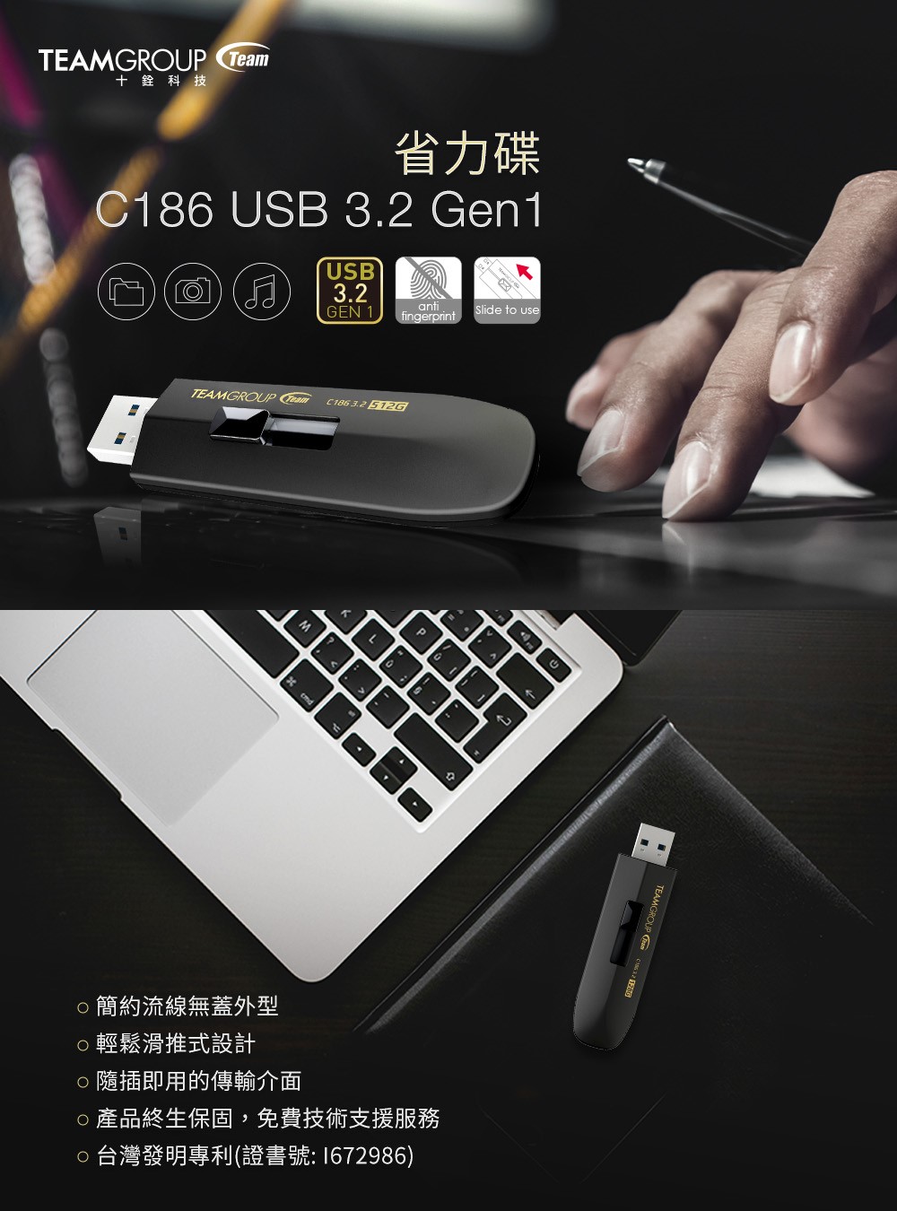 Team 十銓 C186 64GB 省力碟 USB3.2 隨身碟-黑