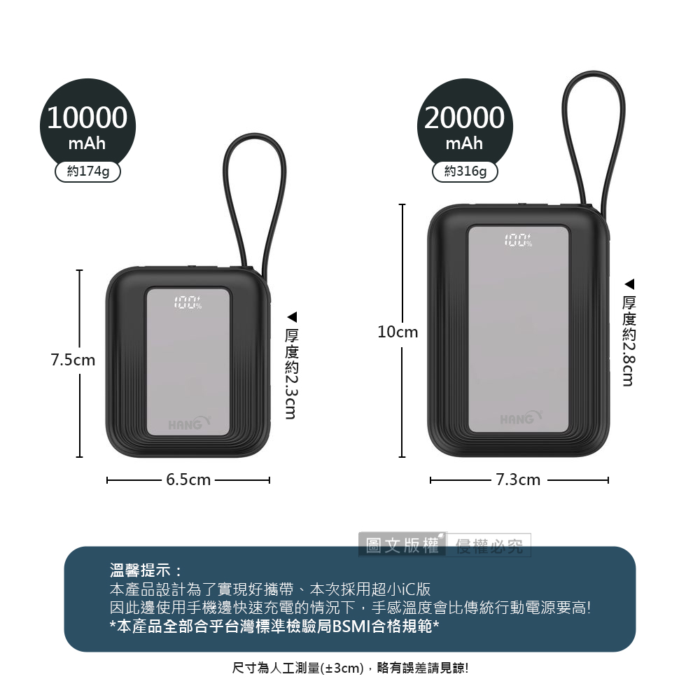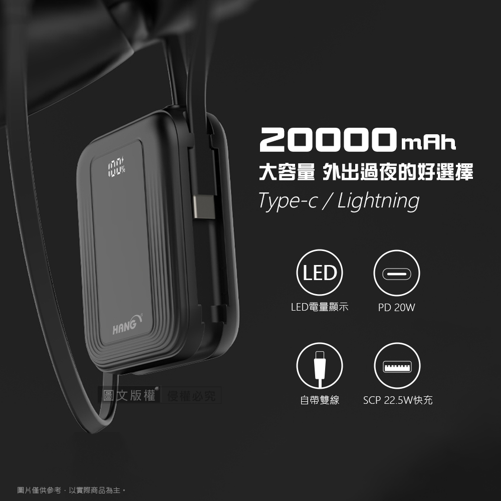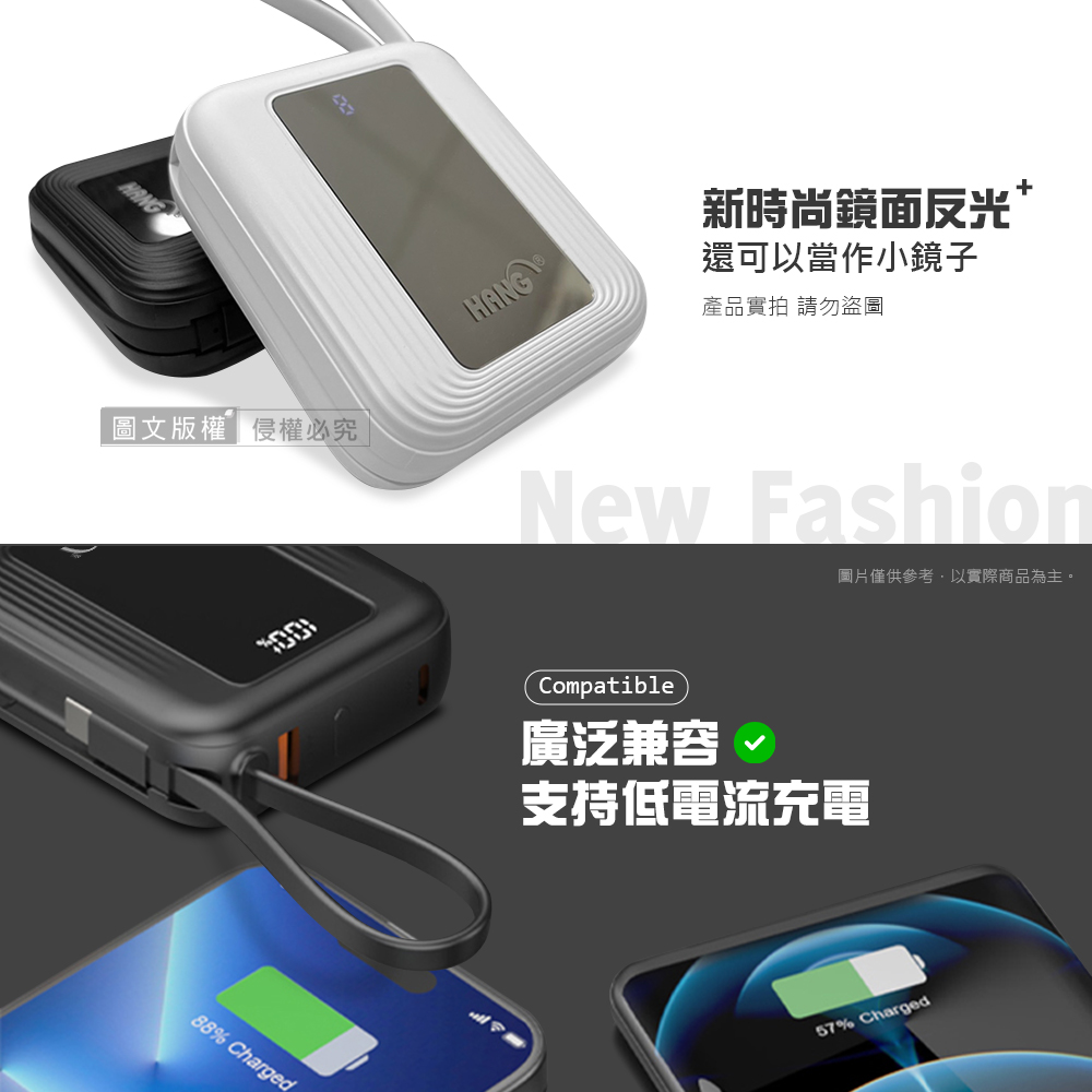 HANG 時尚鏡面 20000mAh PD20W大容量快充行動電源 自帶Type-C/Lightning線(白色)