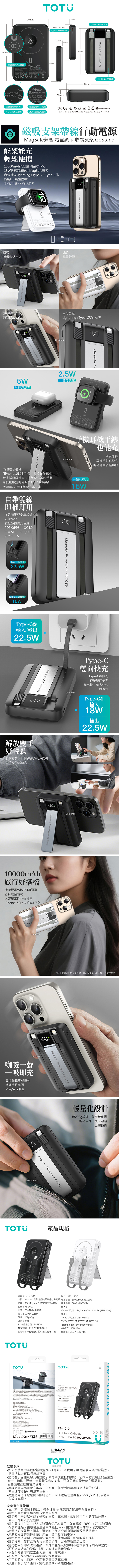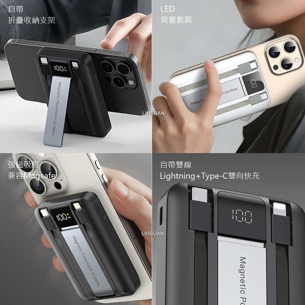 TOTU 可上飛機 Wh/台灣BSMI/NCC/中國CCC認證 10000mAh 磁吸無線充電支架帶線快充行動電源 MagSafe 白色
