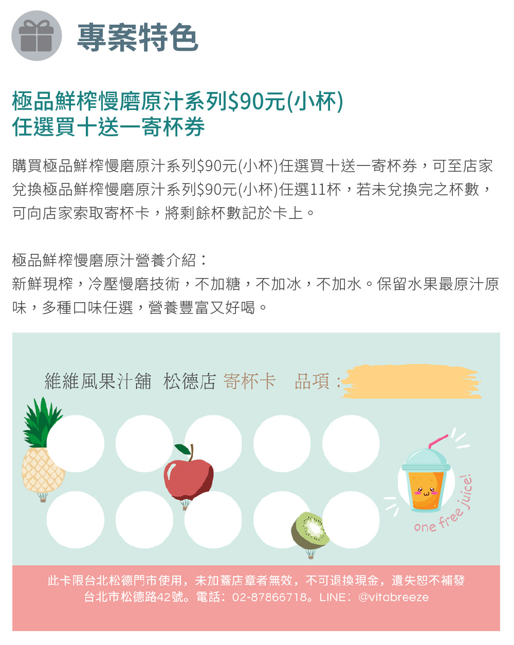 台北信義區【維維風果汁舖】極品鮮榨慢磨原汁系列$90元(小杯)任選買十送一寄杯券(MO)