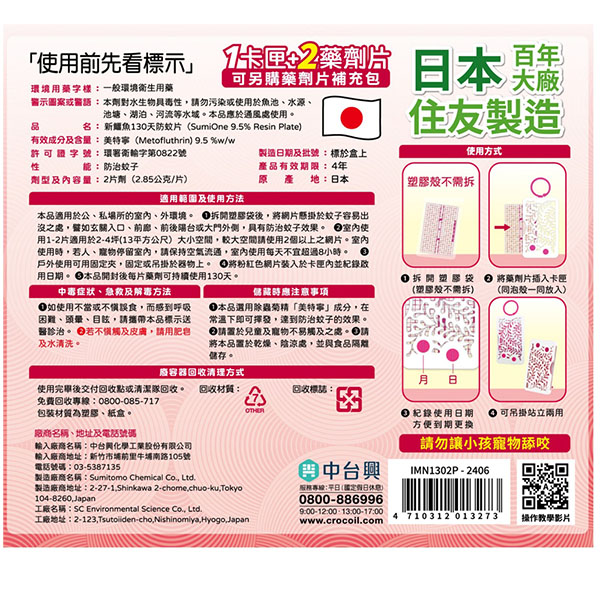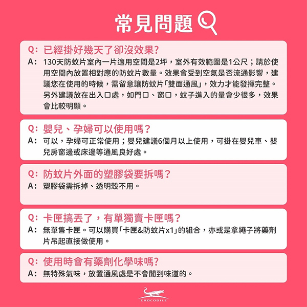 • 新鱷魚130天防蚊片許可證字號:環署衛字輸第0822號