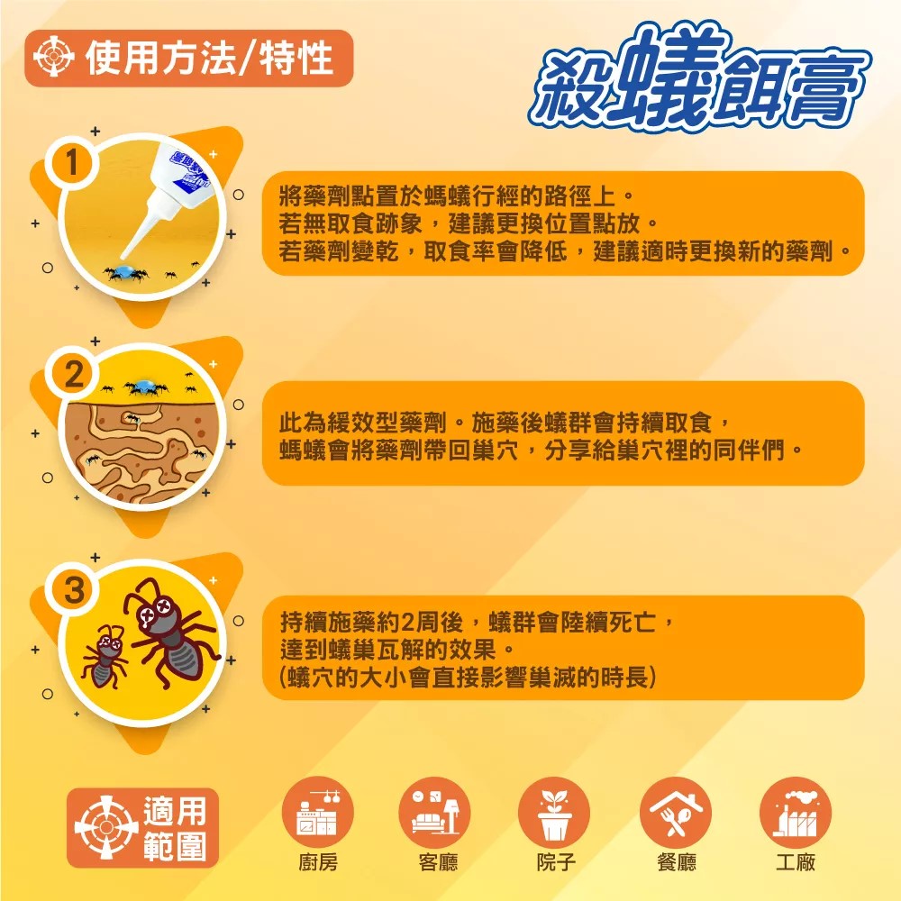 • 將藥劑擠出置於容器內,放於螞蟻出沒處,如蟻群被吸引出且持續數日,將餌劑帶回巢穴,即可發揮效果。