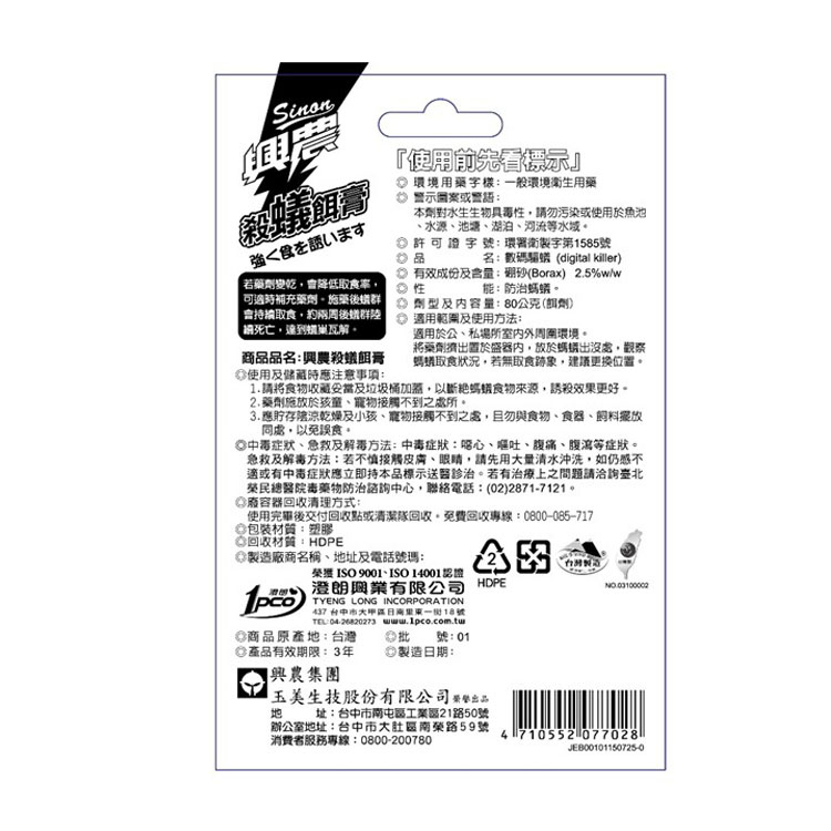 3. 3.本劑為緩效性餌劑,施用約2週後逐漸看不到螞蟻出沒。