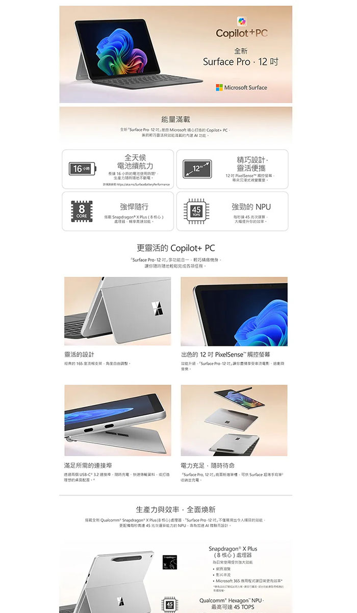 (鍵盤岩灰)微軟 Microsoft Surface Pro 12 (Snapdragon X Plus/16/512)白金
