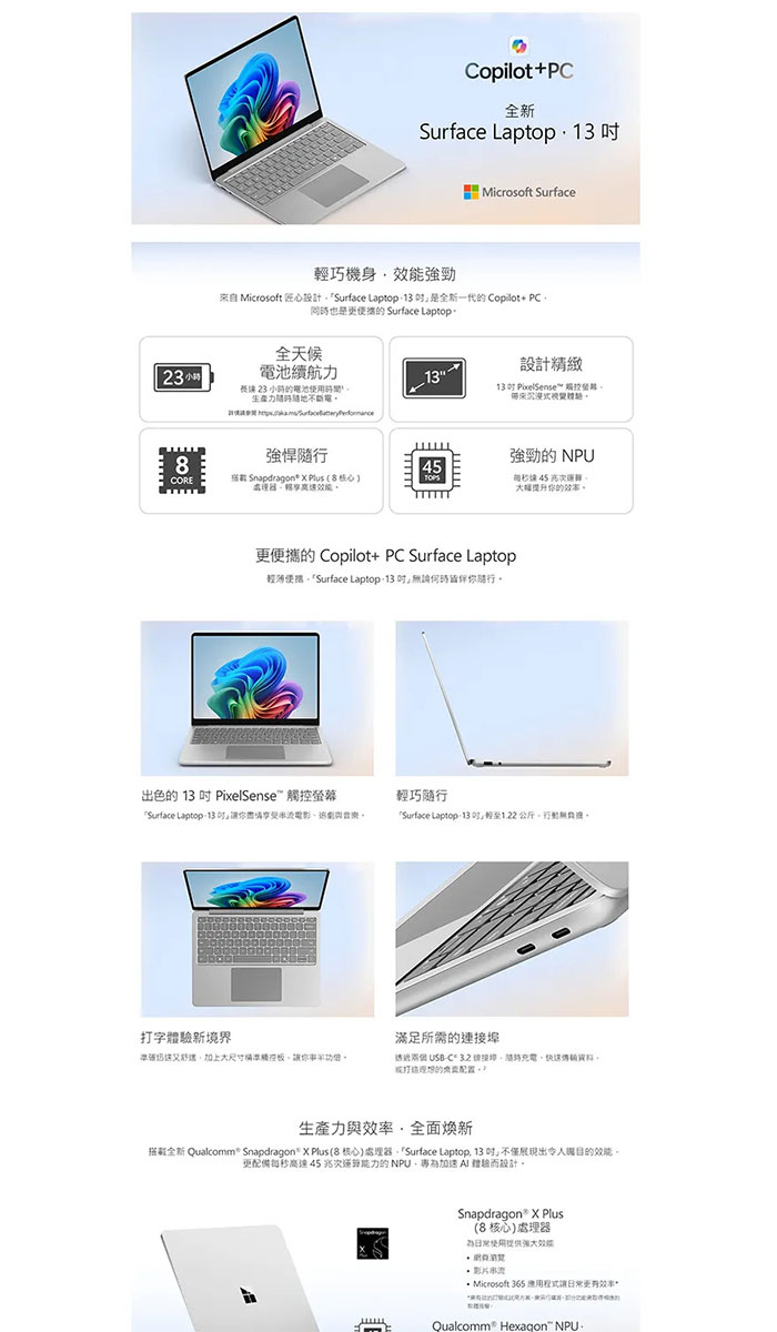 微軟 Microsoft Surface Laptop 13吋(Snapdragon X Plus/16/256)白金