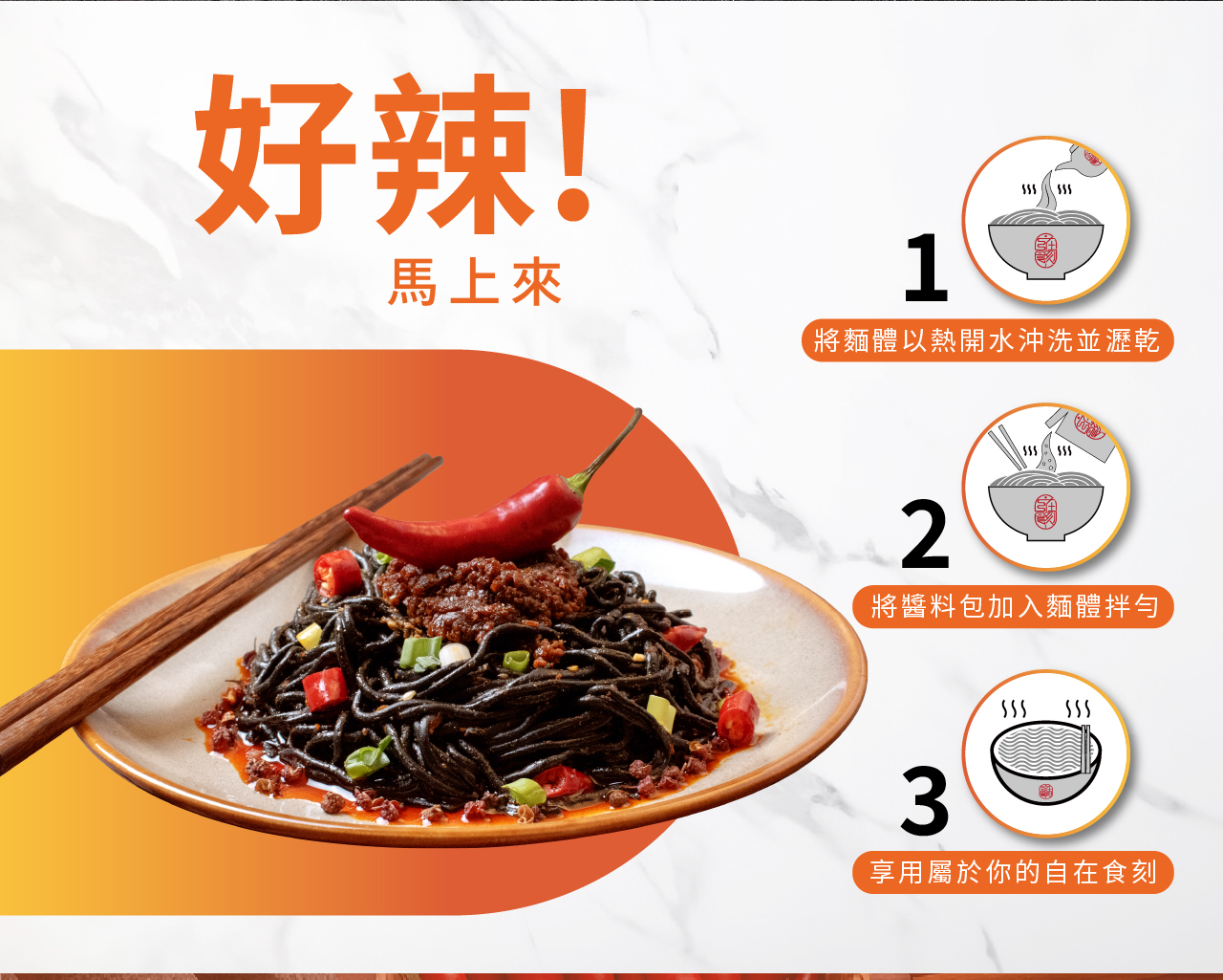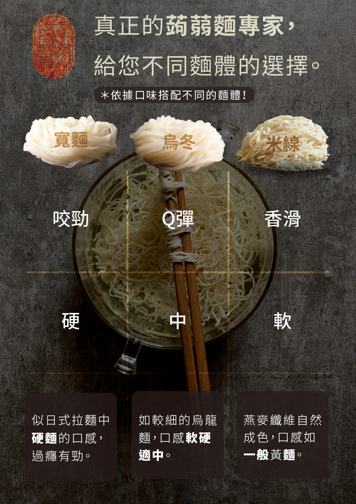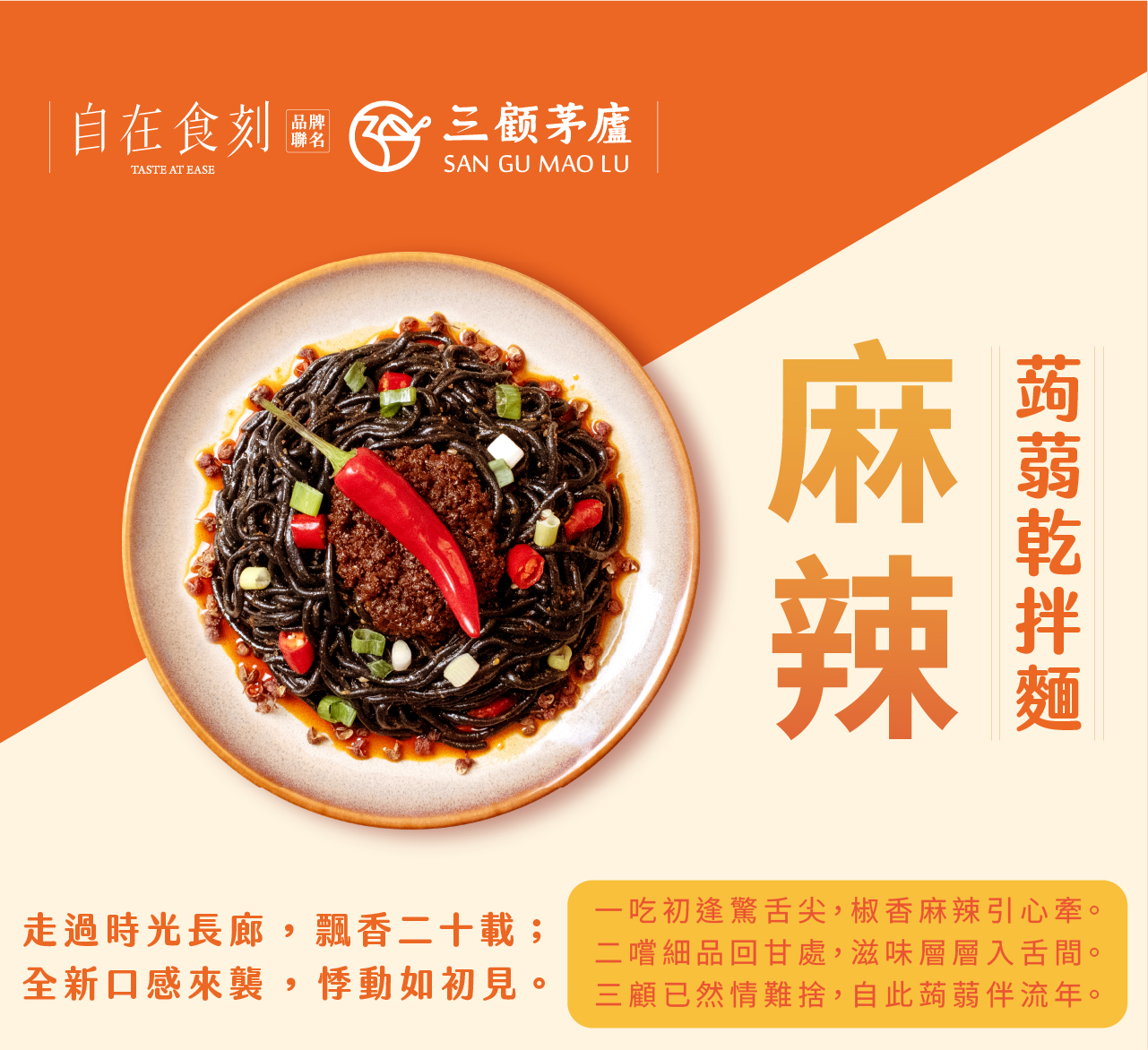 乾麵:  檸檬青醬蒟蒻寬麵1入/濃濃胡麻蒟蒻白麵1入/蔥爆秘醬蒟蒻米線 1入 / 自在食刻x三顧茅廬聯名款-麻辣乾拌麵1入