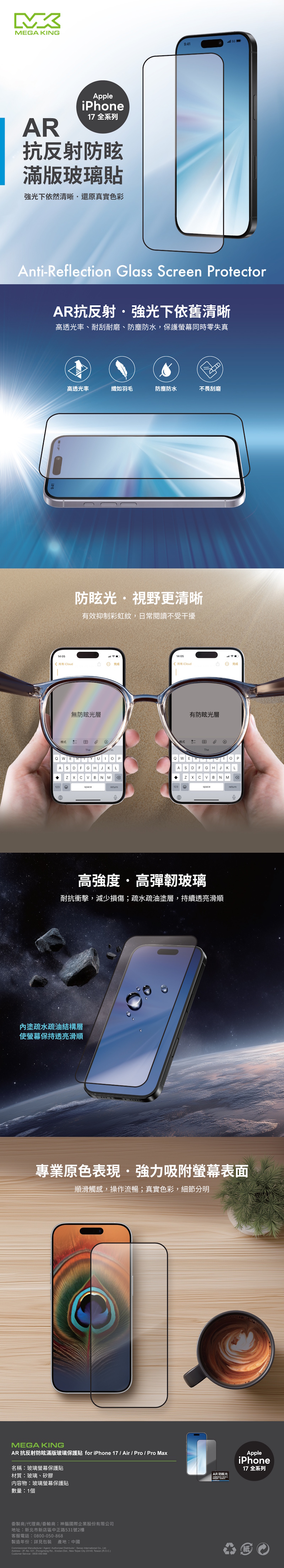 【中華員購】MEGA KING iPhone 17 Pro Max 6.9 AR抗反射防眩滿版玻璃保護貼