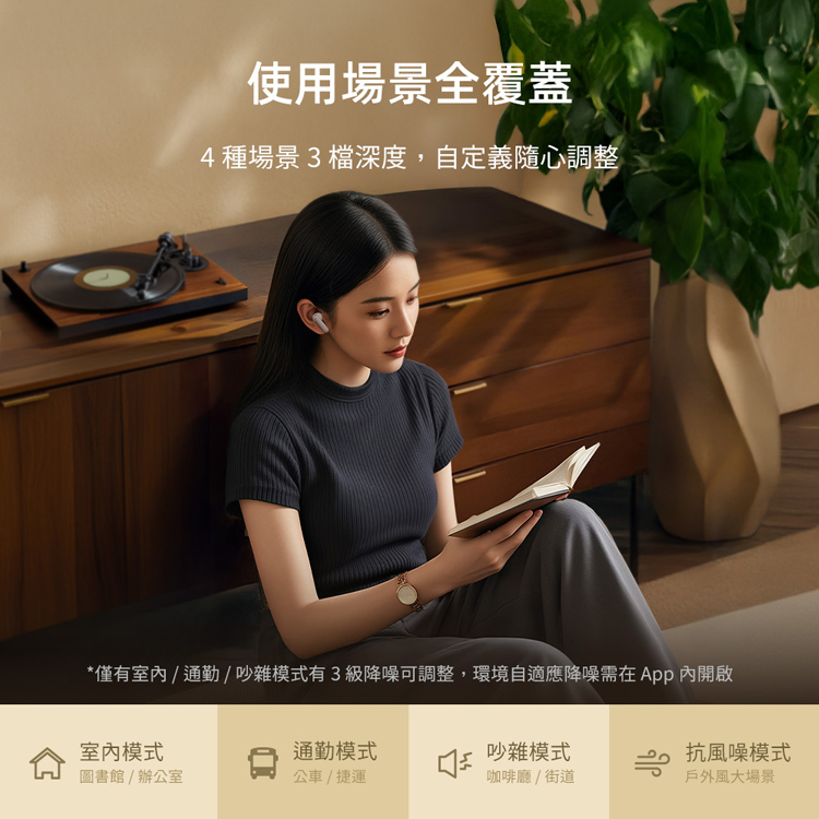 4種降噪場景,3 級深度靈活調整,因應不同環境、聽感更舒適