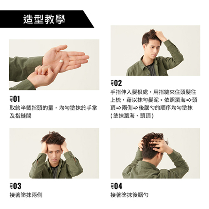 1.手指插入髮根處,用指縫夾住頭髮往上梳,藉以抹勻髮泥