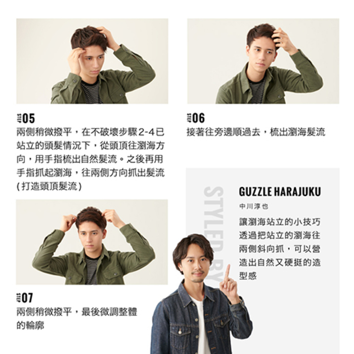 2.頭髮整個站立起來後,從頭頂往瀏海方向,用手指梳出自然髮流