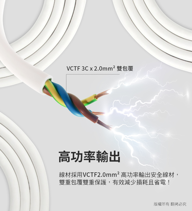 線材採用VCTF 2.0mm²高功率輸出安全線材,雙重包覆,雙重保護!