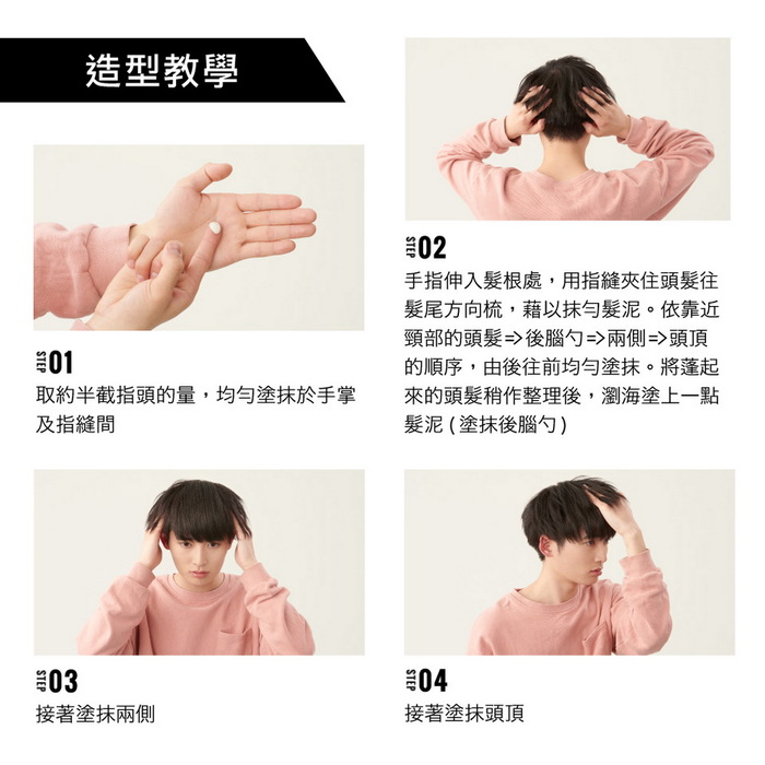 1.手指插入髮根處,用指縫夾住頭髮往上梳,藉以抹勻髮泥