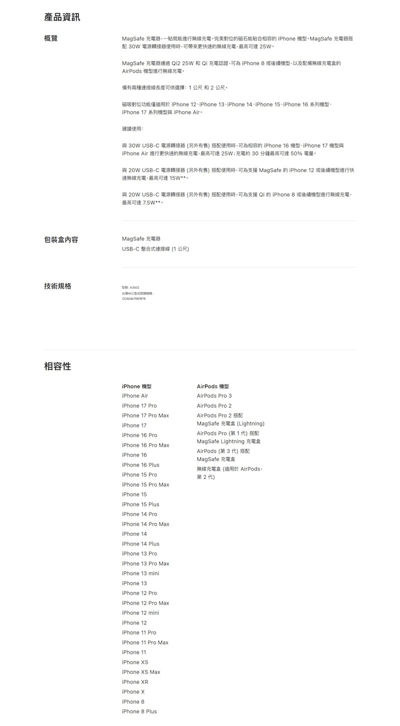 ★MagSafe充電器通過Qi2 25W和Qi充電認證,可為iPhone 8或後續機型,以及配備無線充電盒的 AirPods機型進行無線充電