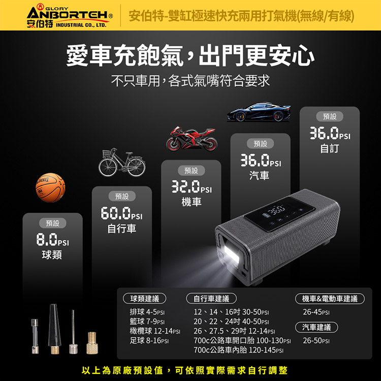 - ★預設胎壓,充飽自停