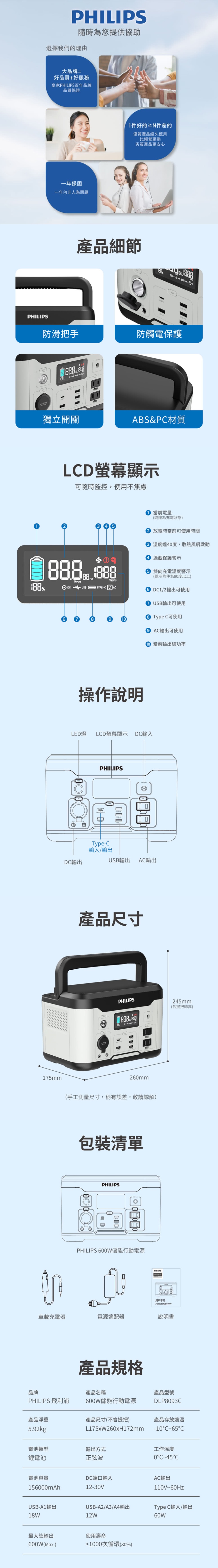 Philips 飛利浦 DLP8093C 600W 攜帶式儲能行動電源(露營/戶外行動電源/UPS不斷電)