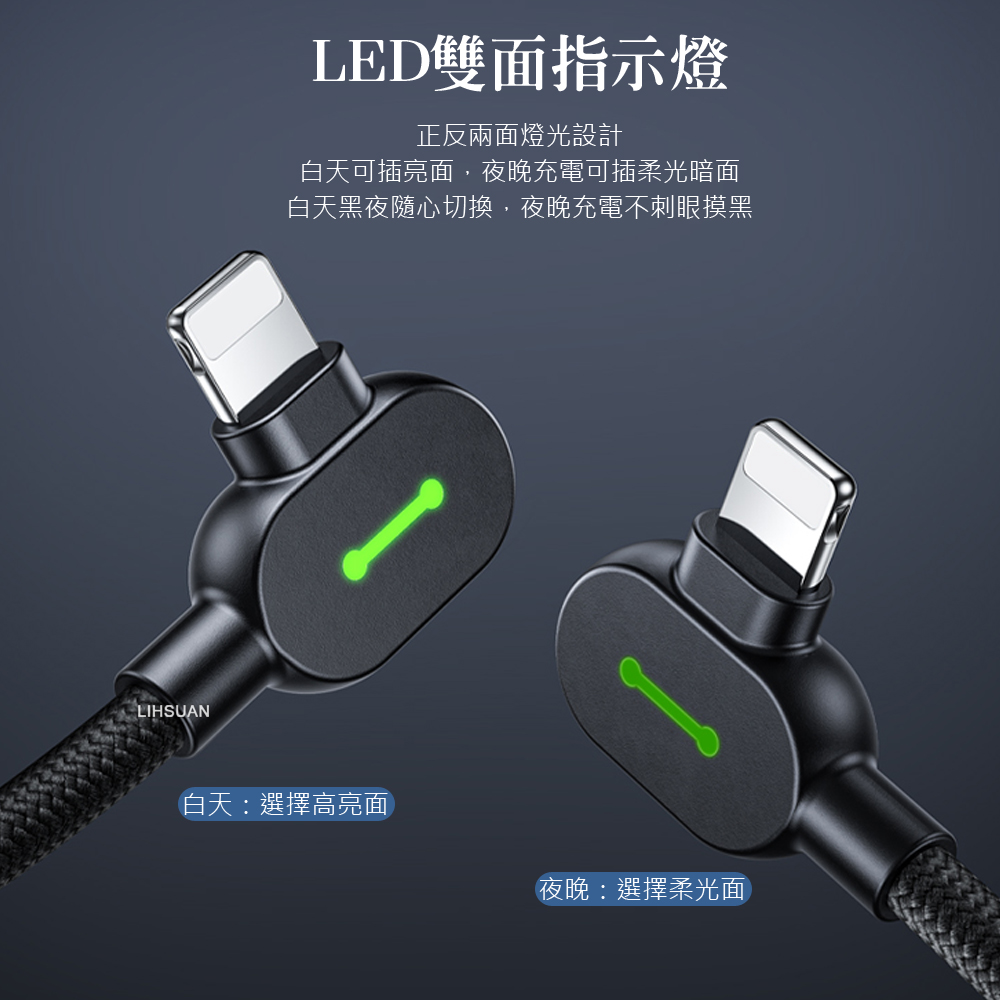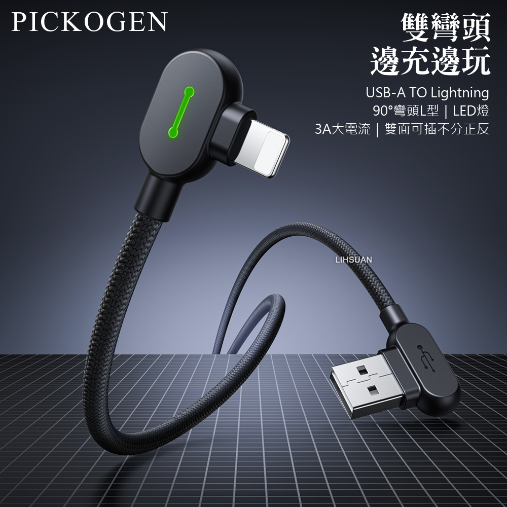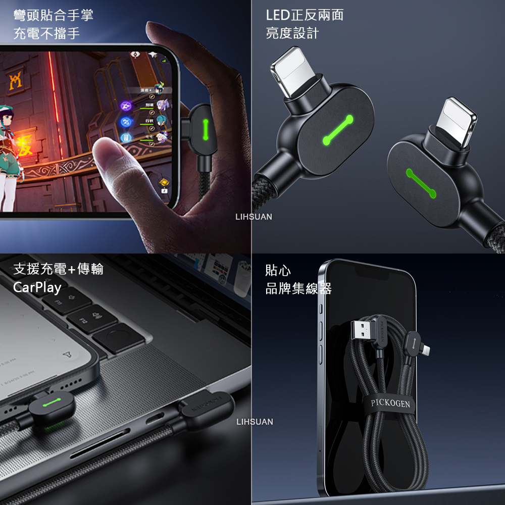 PICKOGEN 皮克全 雙彎頭L型 iPhone/Lightning快充線充電線傳輸線編織線 LED GameFlex 2M