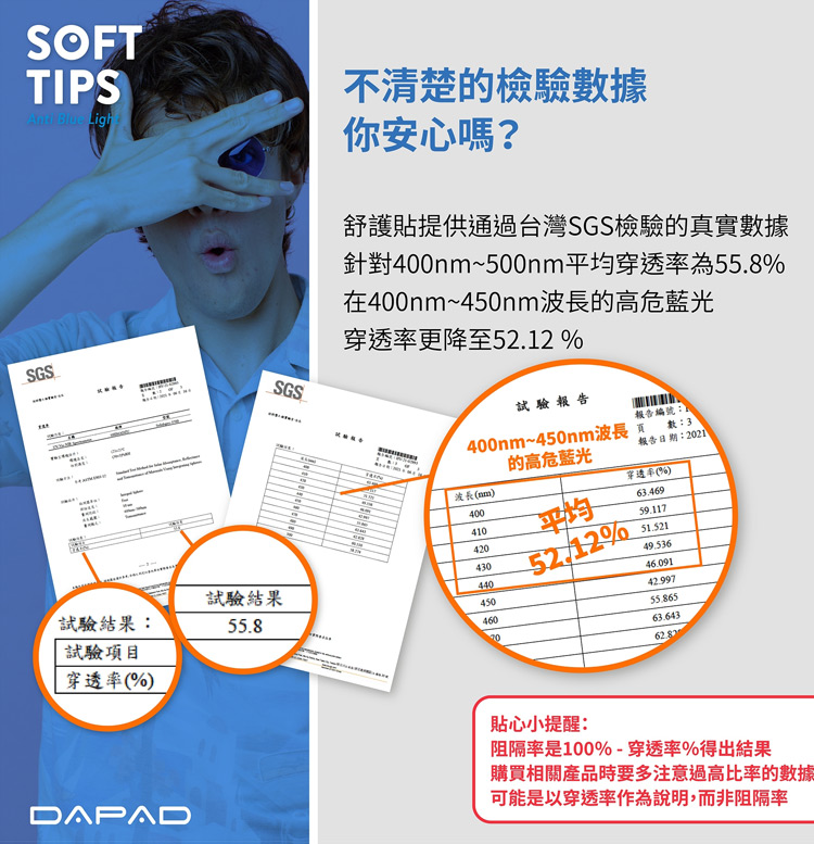 超越市售藍光保護貼的阻隔率 讓使用手機的每一天 都像戴了太陽眼睛般的舒適 經SGS檢驗 47.88%有效阻隔 400nm~450nm波長的藍光 不泛黃 不色偏 讓對色彩敏感的你不再煩惱色差的問題 使用藍光約束特殊塗層及多層膜結構設計 讓產品不僅有效阻隔藍光 表層疏油疏水更不馬虎