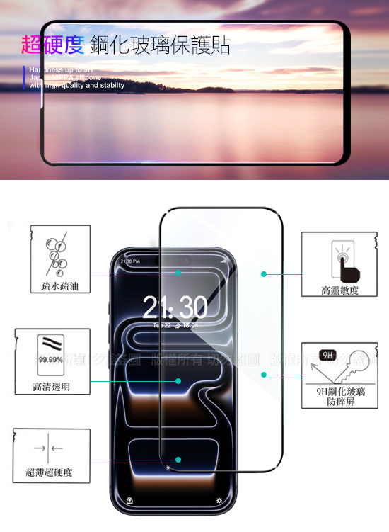 表面頂級9H硬化抗刮耐磨處理,有效防止螢幕刮傷,使螢幕保護貼更加的耐用