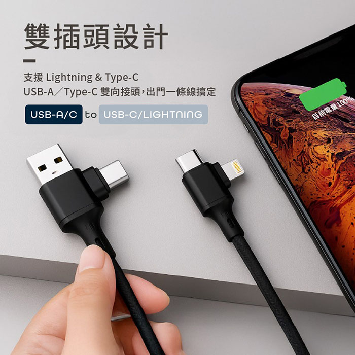 這款雙插頭快充傳輸線,採用USB-A/Type-C雙頭設計,