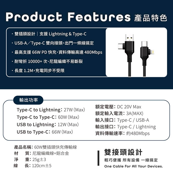 支援Lightning與Type-C設備,一線多用,滿足多種使用情境。