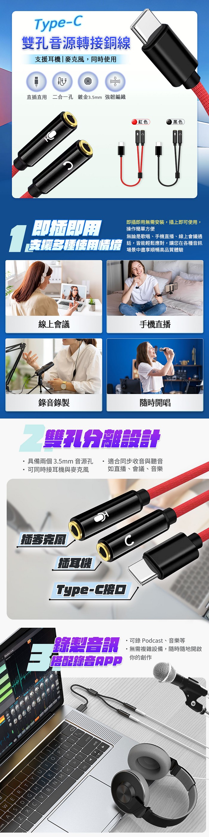 Type-C麥克風音訊轉接線-紅色
