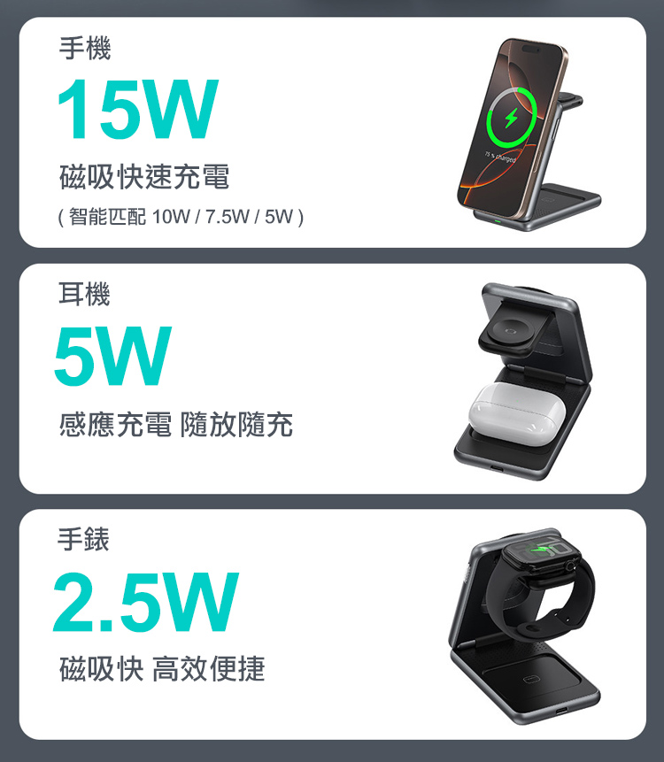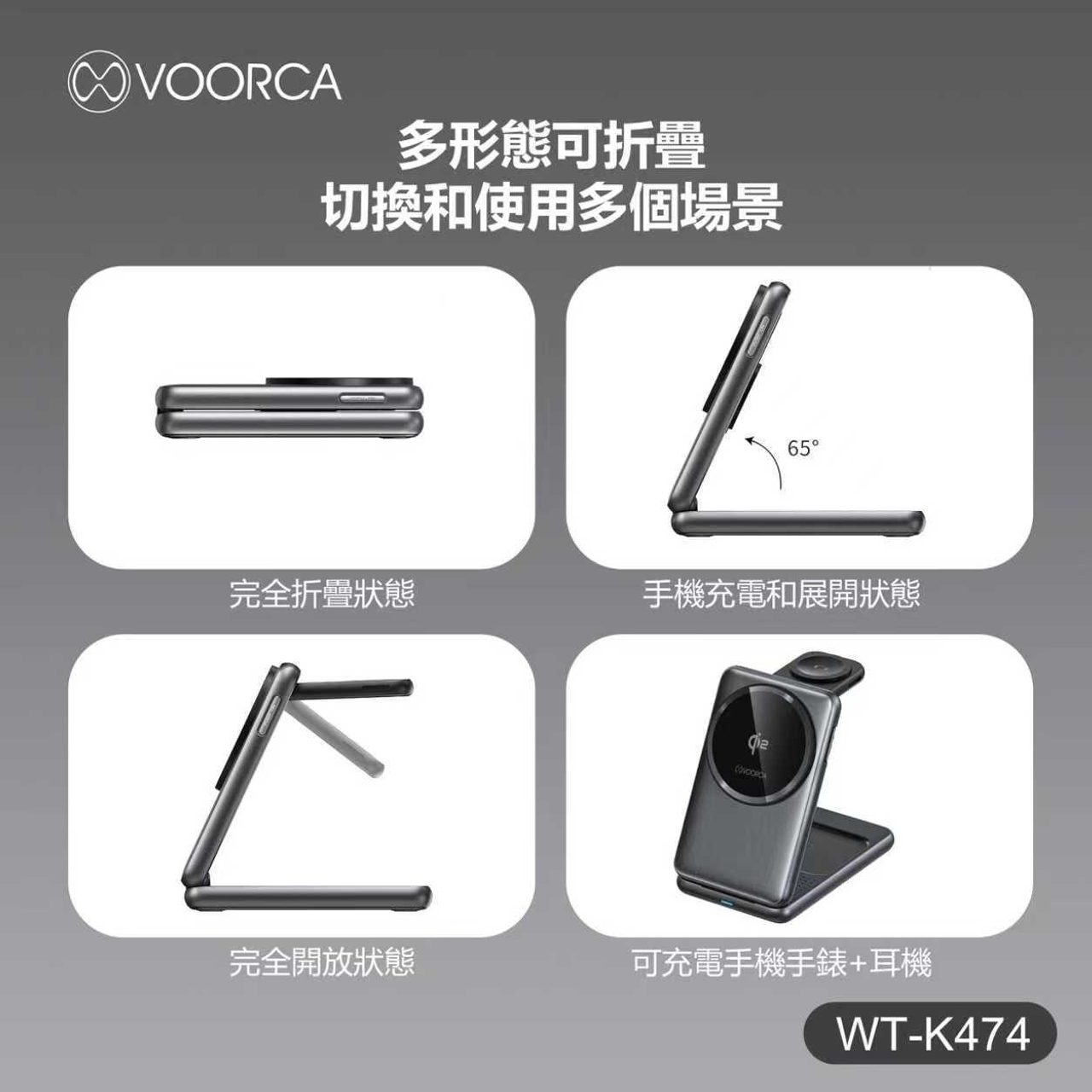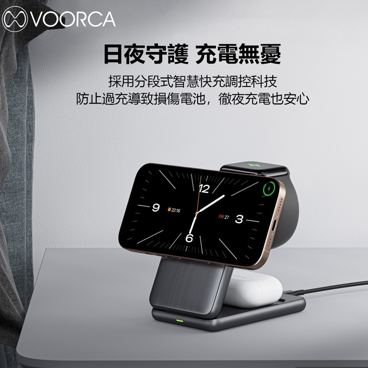 VOORCA WT-K474 Qi2認證15W磁吸無線充電器折疊式三合一 蘋果/三星手錶都可充