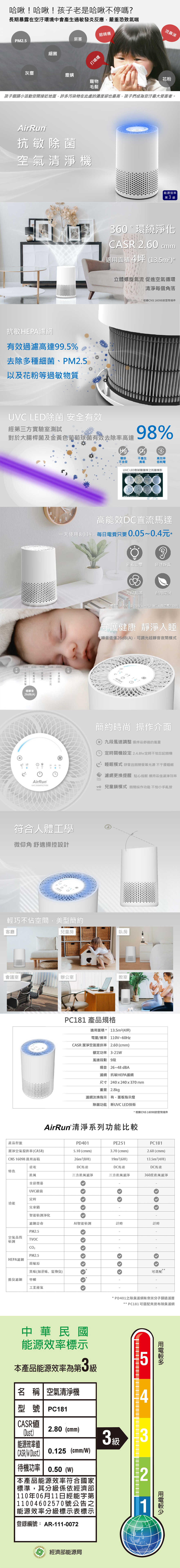 【送濾網】AirRun UVC除菌空氣清淨機-PC181(HEPA濾PM2.5/UVC殺菌/360進風大循環)