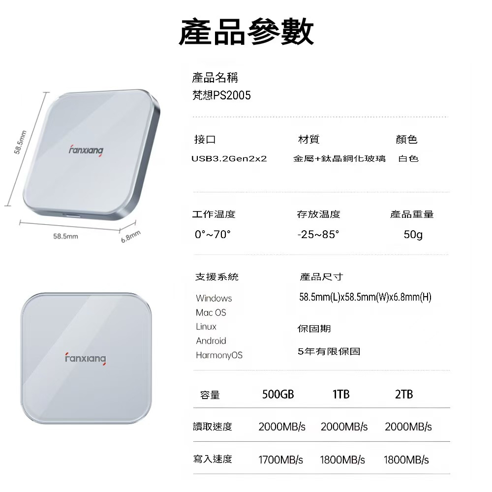 FANXIANG 梵想 PS2005 500GB 磁吸外接式固態硬碟USB3.2Gen2x2(20Gbps)