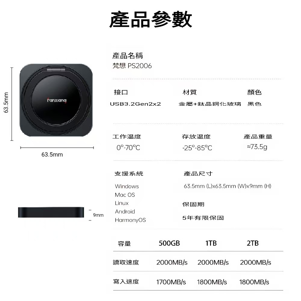 FANXIANG 梵想 PS2006 2TB磁吸外接式固態硬碟USB3.2Gen2x2(20Gbps)