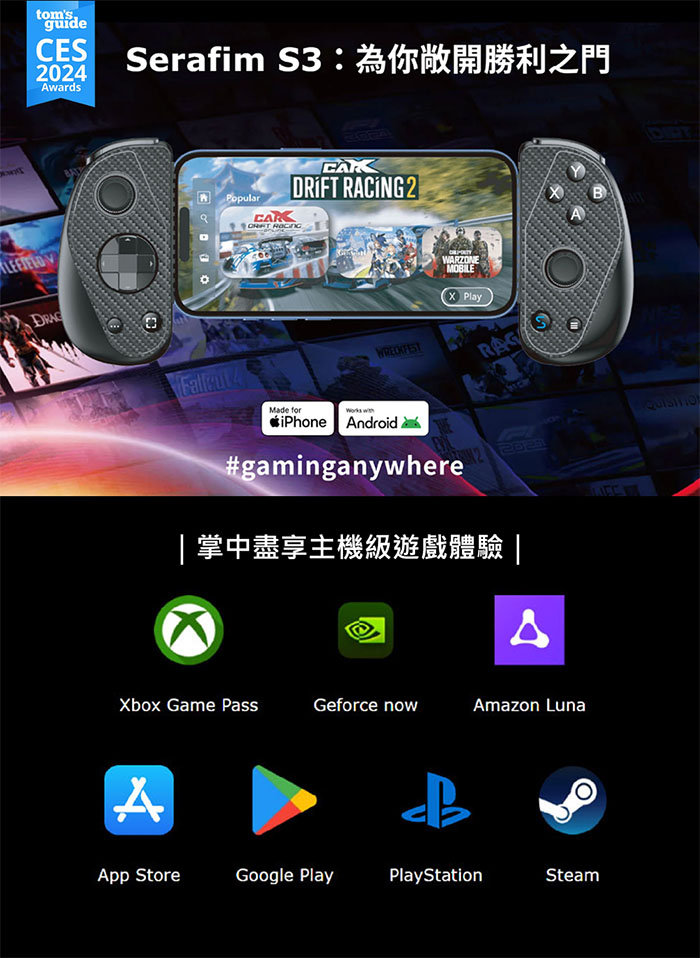 相容各大遊戲平台:Google Play、App Store、PlayStation、Xbox Game Pass、Geforce Now、Steam、Amazon Luna。