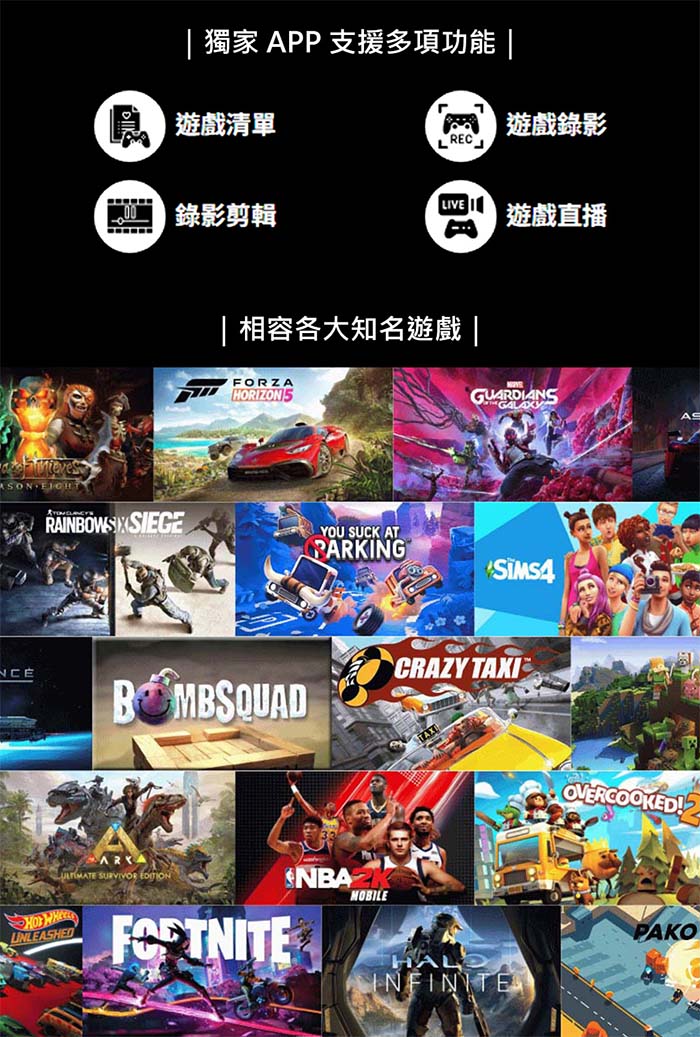 獨家Serafim Console APP支援多項功能:遊戲清單、遊戲錄影、錄影剪輯、遊戲直播。