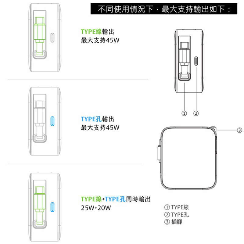 KooPin 45W快充型伸縮線-氮化鎵旅行充電器(黑色)