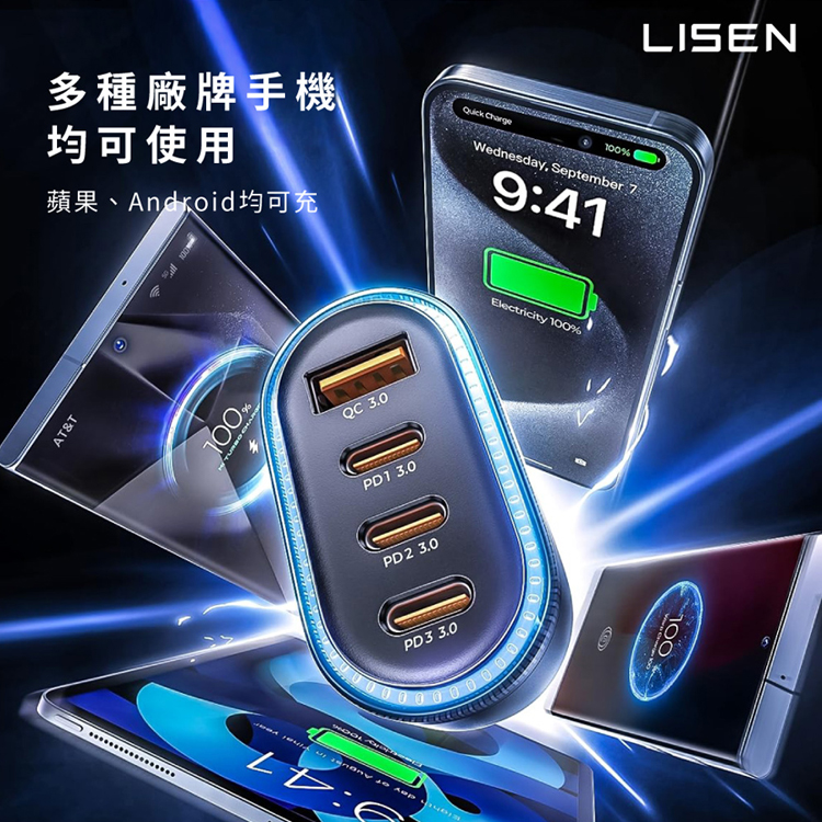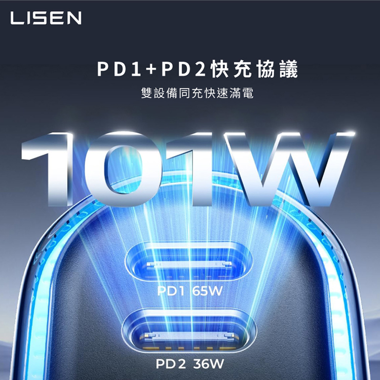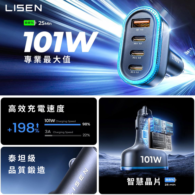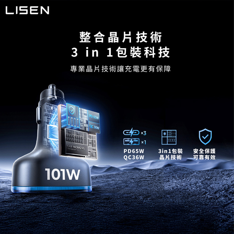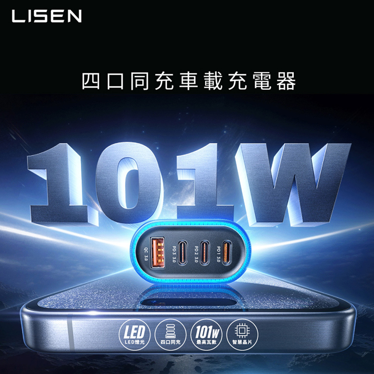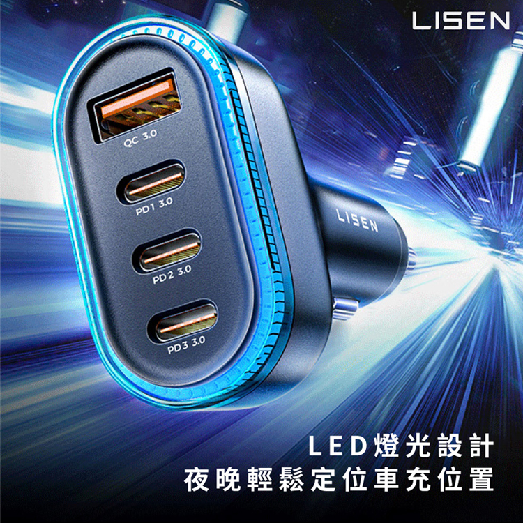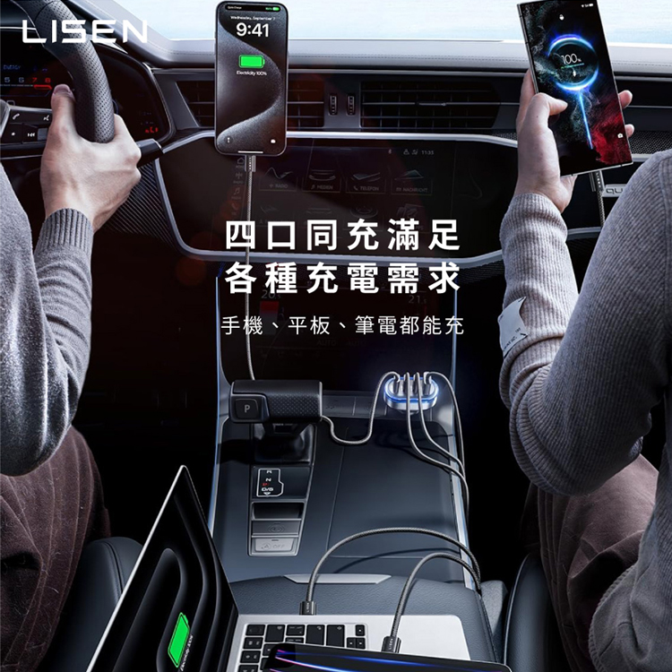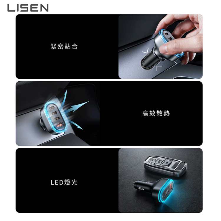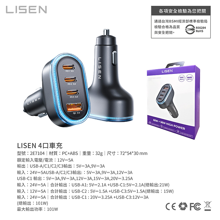 Lisen 36W+65W 4孔車充(3C+1A) 搭配Type-C to Type-C快充線 蘋果、Android均可充