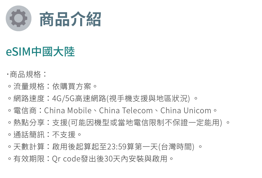 【AOTEX】eSIM中國大陸10天無限高速網路吃到飽兌換券(MO)