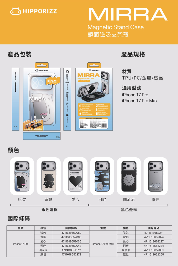 Hipporizz Mirra 河馬 iPhone 17 Pro Max 6.9 鏡面磁吸支架殼-哈欠銀邊框