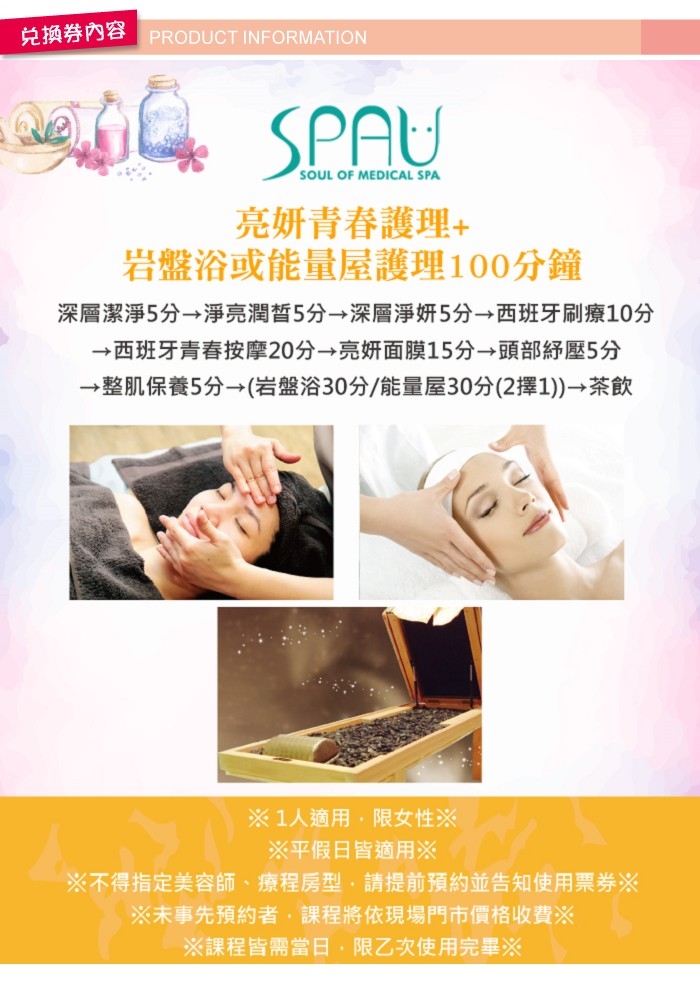 【多分店】SPAU美學聯盟-亮妍青春護理+岩盤浴或能量屋護理100分鐘(二入)